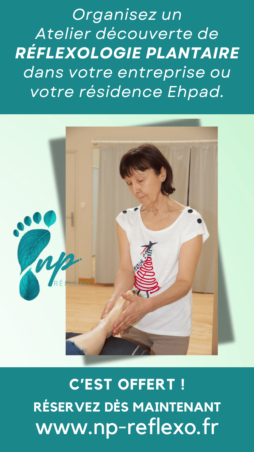 N'hésitez pas à me contacter pour organiser un atelier de Réflexologie Plantaire Intégrative® dans votre Ephad ou entreprise. Offrez à vos participants une parenthèse de détente et de bien-être, et contribuez à leur équilibre physique et émotionnel. NP Réflexo est là pour vous accompagner et vous aider à prendre soin de vos résidents ou salariés.